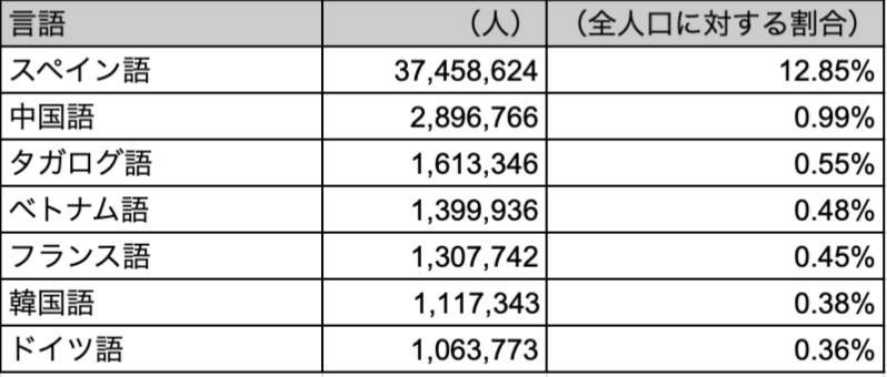 1位はダントツでスペイン語です。だよね。桁違うやん。中南米からの移民は本当に多いですからね。にしても、アメリカ人口の約13%の人がスペイン語を家で話しているなんて…「スペイン語がいつかアメリカの公用語になるだろう」という説はあながち嘘ではないかもしれません。ちなみに、過去にスペイン語をガチで勉強した私にとって、嬉しい結果です。笑