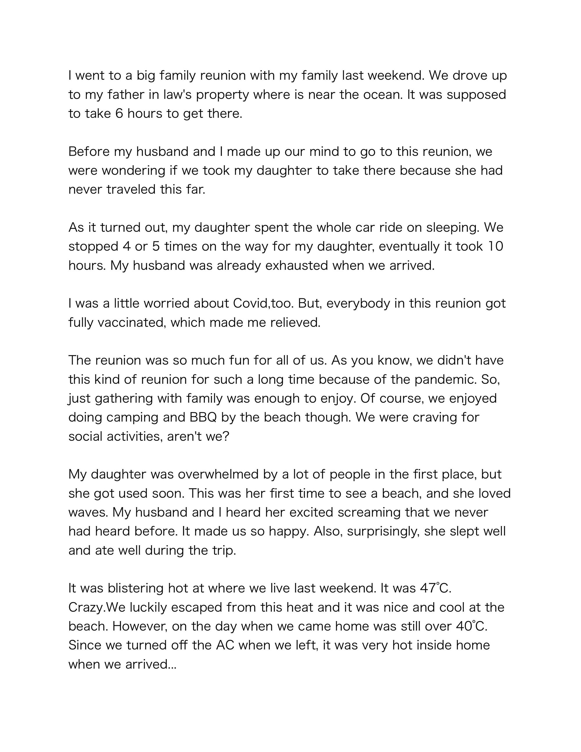 今回は、先週末に家族集会(family reunion)キャンプに参加した話を、日記風に英語で書いてみました。